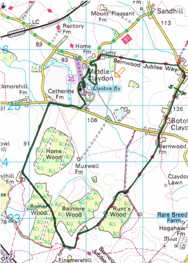 is shown in black and it is run clockwise starting/finishing at the "S-F" symbol that's just North of Botolph Claydon.